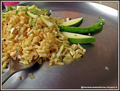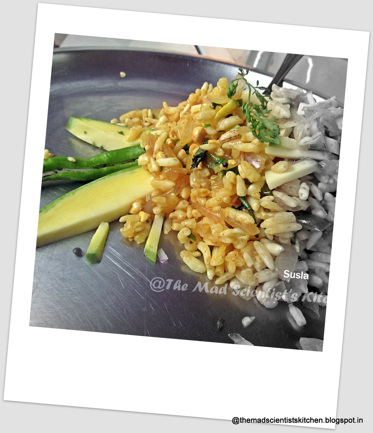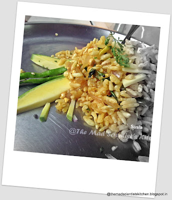 For making susla you need puffed rice, churmuri or churmure. It must have had its beginnings with some puffed rice that had gone soft and it's stuck in our cuisine. The quantity of the puffed rice does go down drastically so please take care.