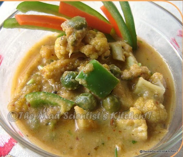 Has it happened to you that you have only 2 cups of cauliflower, 2 tomatoes and 7 small onions ½ a cup green chutney,1 capsicum and you need a vegetable dish with gravy? This is exactly what happened to me a few days ago and here is what I managed to get out of my meagre pantry.